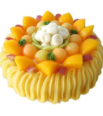 8寸圓形水果蛋糕,黃色奶油流蘇,時令水果搭配。