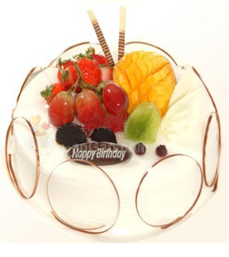 8寸圓形鮮奶水果蛋糕,巧克力片、時令水果搭配。